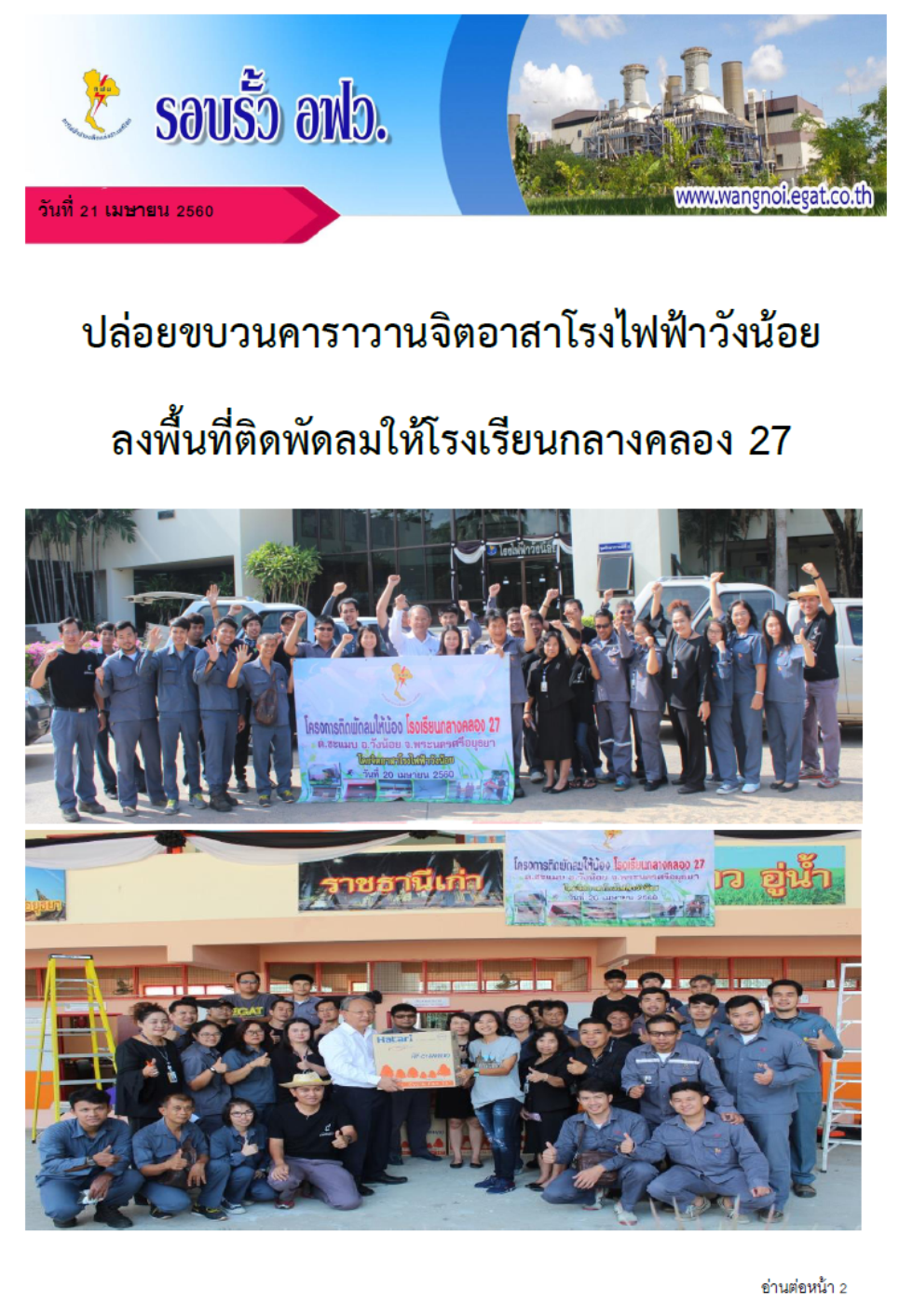 ปล่อยขบวนคาราวานจิตอาสาโรงไฟฟ้าวังน้อยลงพื้นที่ติดพัดลมให้โรงเรียนกลางคลอง 27