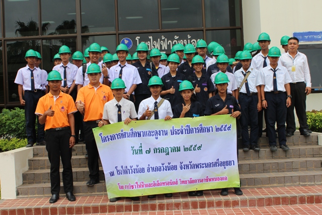 เมื่อวันที่ 5 กรกฎาคม 2559 และวันที่ 7 กรกฎาคม 2559 นายสานิตย์ กุศลไพศาล หัวหน้าแผนกประชาสัมพันธ์และชุมชนสัมพันธ์โรงไฟฟ้าวังน้อยนายระพินทร์ มัสซัม หัวหน้าแผนกเดินเครื่องกะ 2/4 นายไพรัตน์ ละลาย หัวหน้าแผนกเดินเครื่องกะ 2/2 และนายนันทพงศ์ คงอ่อน ช่างระดับ 7 พร้อมผู้ปฏิบัติงานแผนกประชาสัมพันธ์ร่วมให้การต้อนรับ พร้อมบรรยายให้ความรู้เกี่ยวกับการดำเนินงาน ภารกิจ และการจัดการด้านสิ่งแวดล้อมของโรงไฟฟ้าวังน้อยแก่คณะวิทยาลัยการอาชีพชัยบาดาล อำเภอชัยบาดาล จังหวัดลพบุรี โดยมี ครู และนักศึกษา จำนวน 130 คน และคณะวิทยาลัยการอาชีพหนองแค อำเภอหนองแค จังหวัดสระบุรี โดยมี ครู และนักเรียนระดับชั้น ปวช.1 และปวส.1 จำนวน 75 คน ในโอกาสที่มาศึกษาดูงาน และเยี่ยมชมโรงไฟฟ้าวังน้อย ทั้งนี้ เพื่อสร้างเสริมประสบการณ์ และเป็นช่องทางในการเตรียมความพร้อมในการออกฝึกประสบการณ์วิชาชีพต่อไป