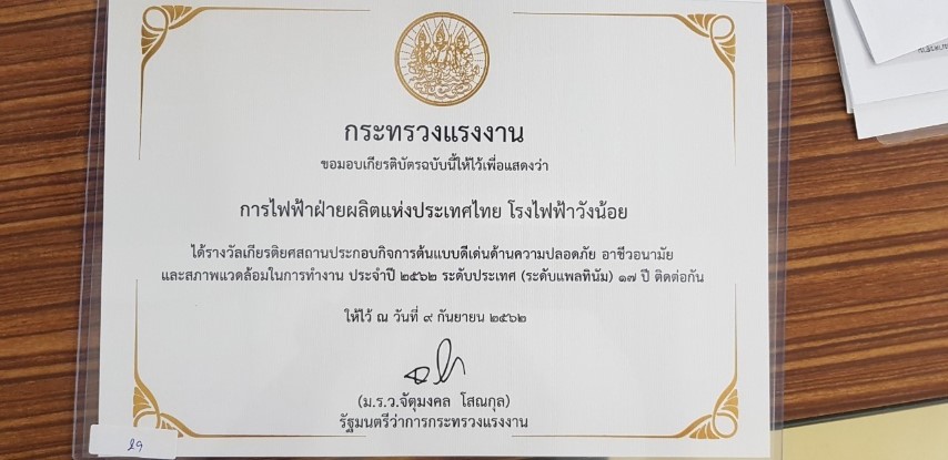 วันที่ 21 สิงหาคม 2562 นายวชิระ วุฒิเวทย์ วิศวกรระดับ 11 เป็นผู้แทน กฟผ. โรงไฟฟ้าวังน้อย เข้ารับมอบเกียรติบัตรสถานประกอบกิจการต้นแบบดีเด่นด้านความปลอดภัย อาชีวอนามัย และสภาพแวดล้อมในการทำงาน ประจำปี 2562 ระดับประเทศ (ระดับแพลทินัม) 17 ปี ติดต่อกัน โดยมี นายวิวัฒน์ ตังหงส์ อธิบดีกรมสวัสดิการและคุ้มครองแรงงาน เป็นผู้มอบ ณ ห้องประชุมใหญ่ กองความปลอดภัยแรงงาน อาคารกรมสวัสดิการและคุ้มครองแรงงาน (ส่วนแยกตลิ่งชัน) กรุงเทพมหานคร