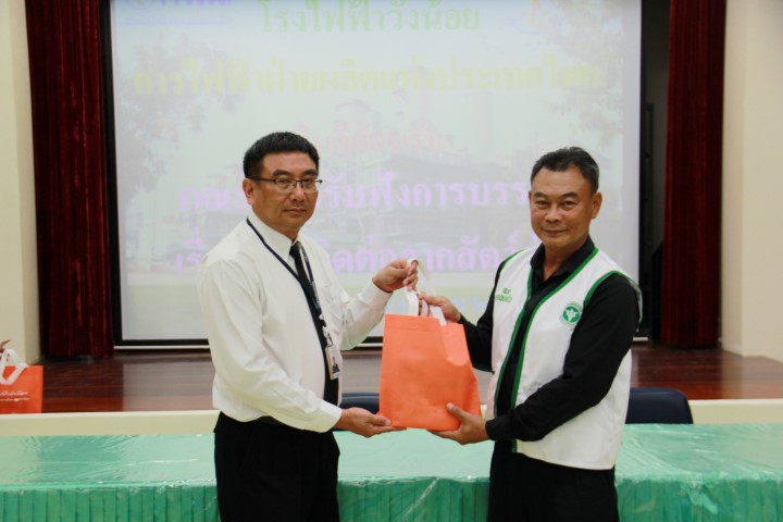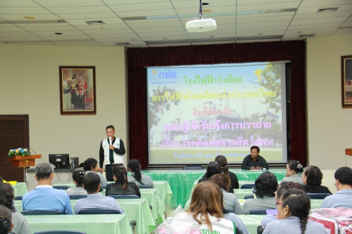 เมื่อวันที่ 22 สิงหาคม 2560 นายไพฑูรย์ ตั้งจิตร่วมบุญ ผู้อำนวยการโรงไฟฟ้าวังน้อย เป็นประธานเปิดการบรรยาย เรื่อง โรคจากสัตว์สู่คนณ หอประชุม 109 อาคารที่ทำการโรงไฟฟ้าวังน้อย จังหวัดพระนครศรีอยุธยา โดยมีคณะอาสาสมัครสาธารณสุขประจำหมู่บ้าน (อสม.) และเจ้าหน้าที่ของโรงพยาบาลส่งเสริมสุขภาพตำบล (รพ.สต.) จำนวน 10 ตำบล ได้แก่ ตำบลวังจุฬา ตำบลข้าวงาม ตำบลชะแมบ ตำบลสนับทึบ ตำบลวังน้อย ตำบลพะยอม ตำบลหนองโสน ตำบลลำตาเสา ตำบลบ่อตาโล่ และตำบลหันตะเภา รวมจำนวน 80 คน เข้าฟังบรรยาย โดยมีนายสมศักดิ์ เลาหภิชาติชัย สาธารณสุขอำเภอวังน้อย นายฟุ้ง ชัยเพ็ชร์ ปศุสัตว์อำเภอวังน้อยเป็นวิทยากร ทั้งนี้ เพื่อสร้างความรู้ความเข้าใจ เกี่ยวกับสถานการณ์ของปัญหาด้านสุขภาพอนามัยของประชาชนในปัจจุบันที่เกิดจากสัตว์สู่คน แนวทางการรักษาและการป้องกันการระบาด ตลอดจนเฝ้าระวัง พร้อมกันนี้ โรงไฟฟ้าวังน้อยได้มอบกระเป๋าพยาบาลจำนวน 10 ใบ ให้แก่ ผู้แทน รพ.สต. ไว้ใส่ยาและอุปกรณ์เวชภัณฑ์ สำหรับลงพื้นที่ตรวจรักษาผู้ป่วย