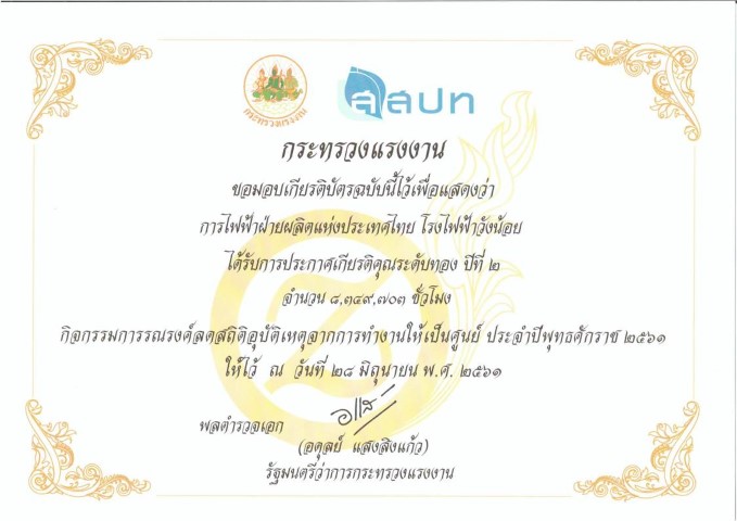 เมื่อวันที่ 28 มิถุนายน 2561 นายวชิระ วุฒิเวทย์ วิศวกรระดับ 11 โรงไฟฟ้าวังน้อย เป็นผู้แทนโรงไฟฟ้าวังน้อย เข้ารับมอบโล่ประกาศเกียรติคุณระดับทอง ปีที่ 2 โครงการรณรงค์ลดสถิติอุบัติเหตุจากการทำงานให้เป็นศูนย์ประจำปี 2561 (Zero Accident Campaign 2018) โดยมี พลตำรวจเอก อดุลย์ แสงสิงแก้ว รัฐมนตรีว่าการกระทรวงแรงงาน เป็นประธานมอบ ในงานความปลอดภัยและอาชีวอนามัยแห่งชาติ ครั้งที่ 32 ซึ่งจัดโดย สถาบันส่งเสริมความปลอดภัย อาชีวอนามัย และสภาพแวดล้อมในการทำงาน (องค์การมหาชน) ณ ห้องแกรนด์ฮอลล์ 201-203 ศูนย์นิทรรศการและการประชุมไบเทค บางนา กรุงเทพมหานคร