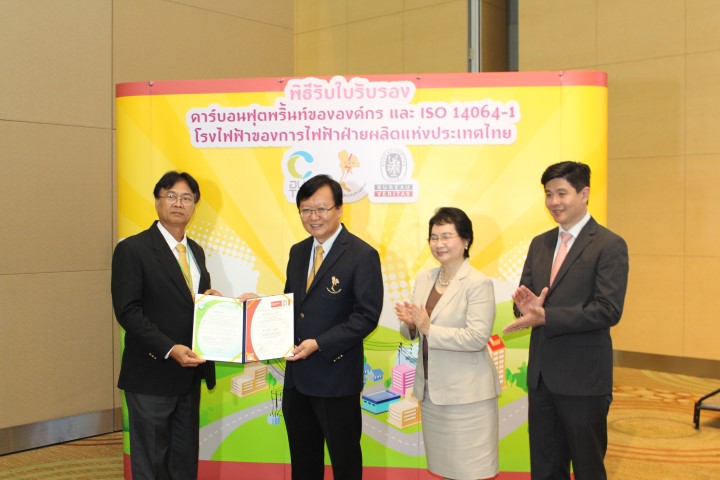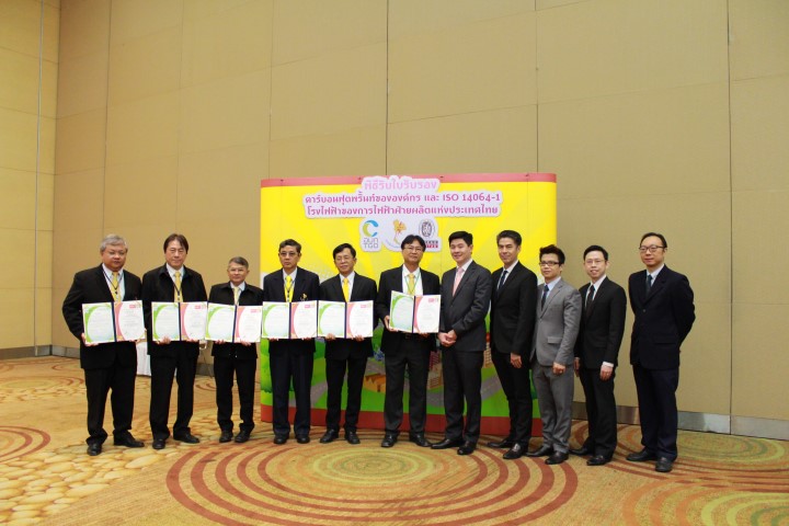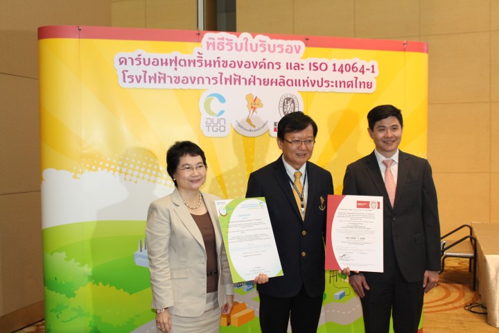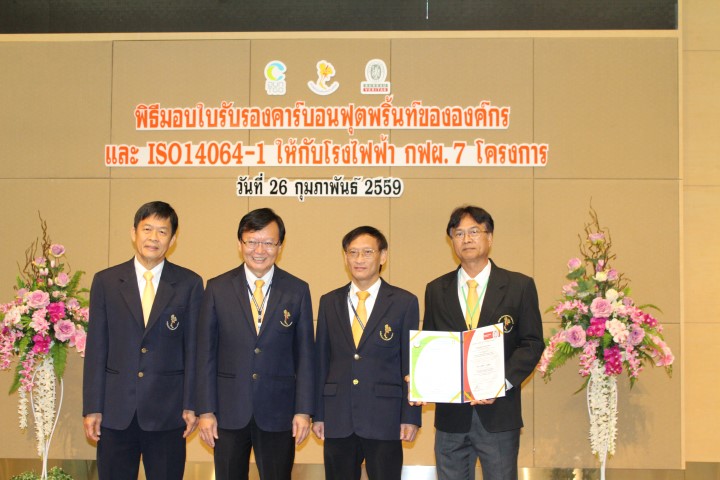 เมื่อวันที่ 26 กุมภาพันธ์ 2559 นายสุนชัย คำนูณเศรษฐ์ ผู้ว่าการการไฟฟ้าฝ่ายผลิตแห่งประเทศไทย (กฟผ.) เป็นผู้แทนรับมอบใบรับรองคาร์บอนฟุตพริ้นท์ขององค์กรและมาตรฐานการจัดทำบัญชีการปล่อยก๊าซเรือนกระจก ISO 14064-1 ของโรงไฟฟ้า 7 แห่ง จาก นางประเสริฐสุข จามรมาน ผู้อำนวยการองค์การบริหารจัดการก๊าซเรือนกระจก และนายอุดมเดช คงทวีเลิศ ประธานบริหาร บริษัทบูโร เวอริทัส เซอทิฟิเคชั่น (ประเทศไทย) จำกัด ณ หอประชุมเกษม จาติกวณิช สำนักงานใหญ่ กฟผ. ทั้งนี้ โรงไฟฟ้าทั้ง 7 แห่ง ของ กฟผ. ซึ่งประกอบด้วย โรงไฟฟ้าแม่เมาะ โรงไฟฟ้าน้ำพอง โรงไฟฟ้าวังน้อย โรงไฟฟ้าพระนครใต้ โรงไฟฟ้าบางปะกง โรงไฟฟ้ากระบี่ และโรงไฟฟ้าจะนะ ได้ผ่านการรับรองคาร์บอนฟุตพริ้นท์ขององค์กร โดยเป็นองค์กรที่มีส่วนร่วมในการลดการปล่อยก๊าซเรือนกระจกอันเป็นสาเหตุของการเกิดภาวะโลกร้อนอย่างมีประสิทธิภาพ ตลอดจนผ่านมาตรฐานการจัดทำบัญชีการปล่อยก๊าซเรือนกระจก ISO 14064-1 ซึ่งแสดงถึงความโปร่งใส ในการเปิดเผยข้อมูลการปล่อยก๊าซเรือนกระจก